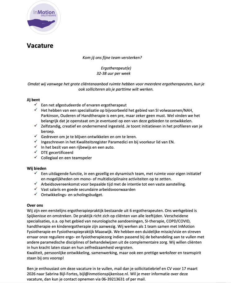 Vacature Ergotherapeut(e) voor 32 – 38 uur per week23 februari 2026Geschreven door Roy Berg Klik hier om de PDF te bekijken.